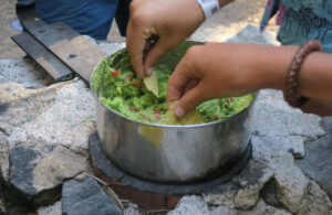 1.Prep your chopped ingredients: Dice large white onion and set divide for each different component. Smash three cloves of garlic, dicing one finely for guac. Zest the lime and set aside (if you need zest, always do this before juicing). Dice tomato and seeded jalapeno. If you’re in the frontcountry or at home remove the leaves from the cilantro bunch and roughly chop.